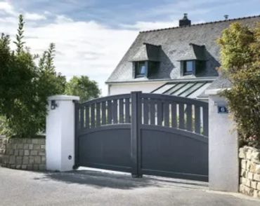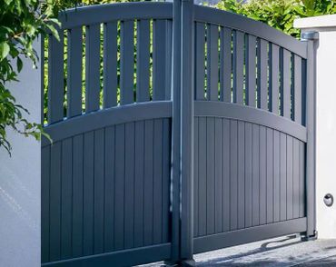 Trebez is an enduring favourite, 90mm boards opening to a spaced curve at the top. This style has a number of companions, there are 2 types of curve; the standard curve here and the charmingly entitled ‘chapeau de Gendarme’ curve in the Enez panel. It also comes in inverted curves or a curve below a straight top and even open ovals, if you would like to see all the options just ask our consultant. Another style that looks beautiful in either powder-coat or foil overlay. Fencing to compliment this gate would be either the 90mm closed vertical boarded, curved Tremen or choose a straight top with a 90mm closed vertical boarded Tiviz.